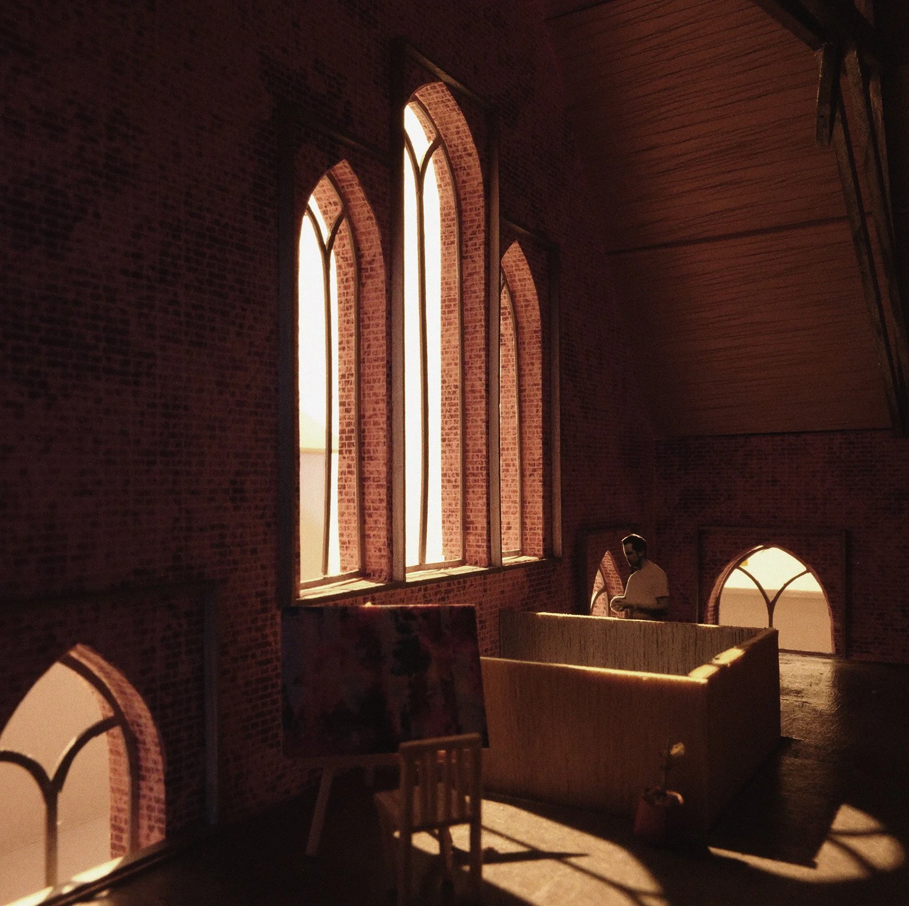 私たちが初めてこの教会を訪れた時、会衆席や身廊、祭壇など、宗教的な機能と装飾の多くは、既にディベロッパーの手によって強制的に剥ぎ取られていた。それは呼応関係を断ち切られ、ほつれ破れた織物のようだった。しかし幸いなことに、ステンドグラスでつくられたランセット窓やパイプオルガン搬入用の巨大な開口部などは、辛うじて竣工当時の状態を保っていたことから、それらを拠り所にダーニングを施すことにした。例えばランセット窓の部屋内側には、痛んだステンドグラスの保護と断熱用空気層の確保を兼ね、もう一層ガラスサッシを設けた。その間にスラブを挟み込むことで、一階部分では高窓として天井を照らすステンドグラスが、二階部分では足元を仄かに照らす地窓となる。教会では宗教的装飾の大役を担っていたステンドグラスが、住宅においては日常に色を添える部分へと変わり、それが他の部分と関係を取り結ぶことで、この建築の住宅としての新たな全体性を築いていくだろう。