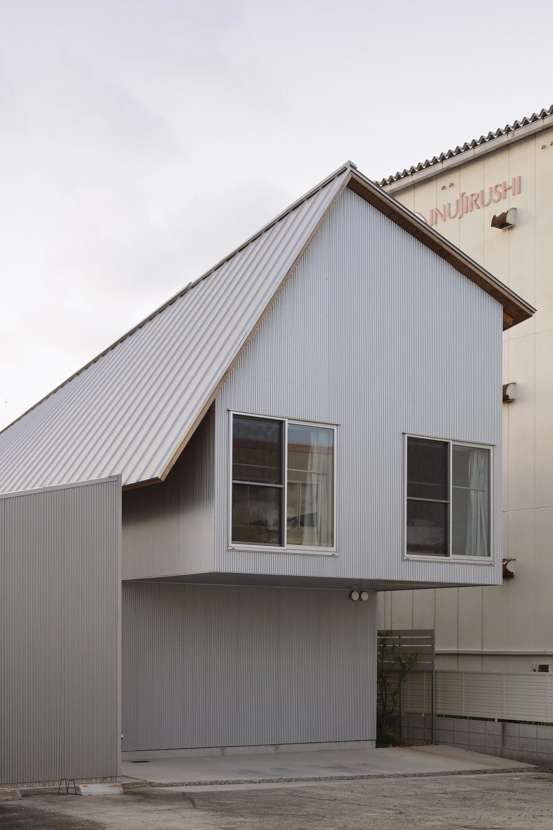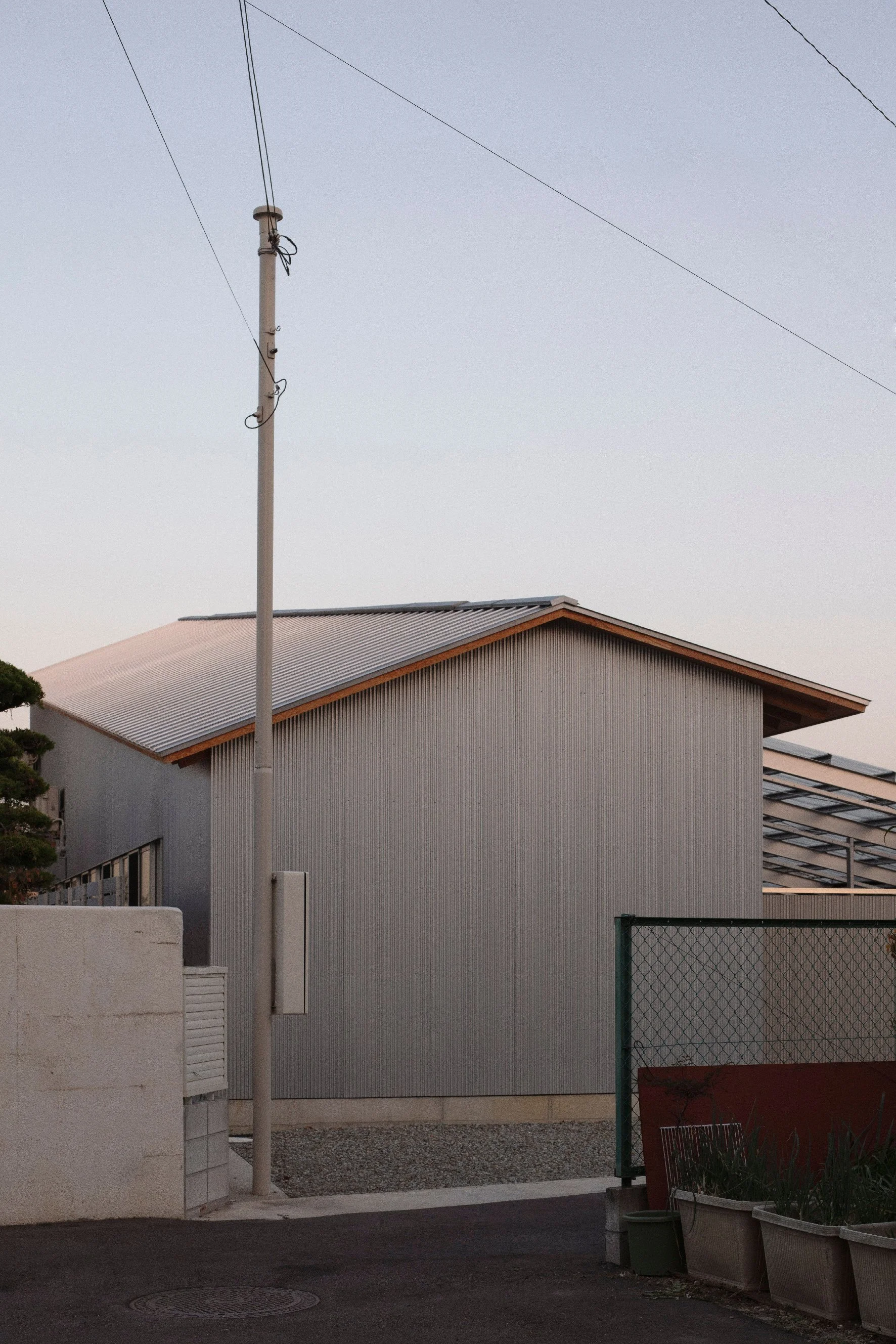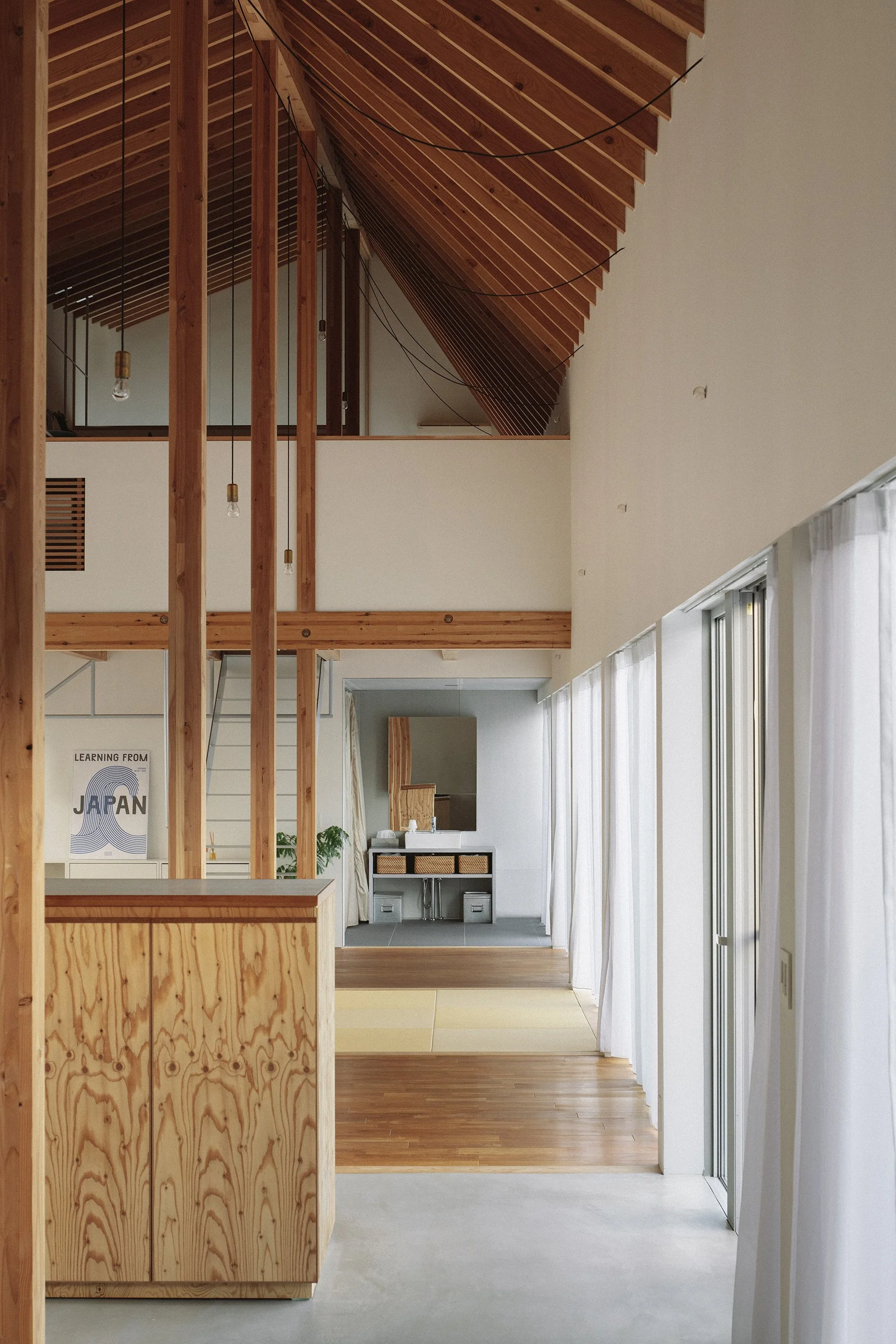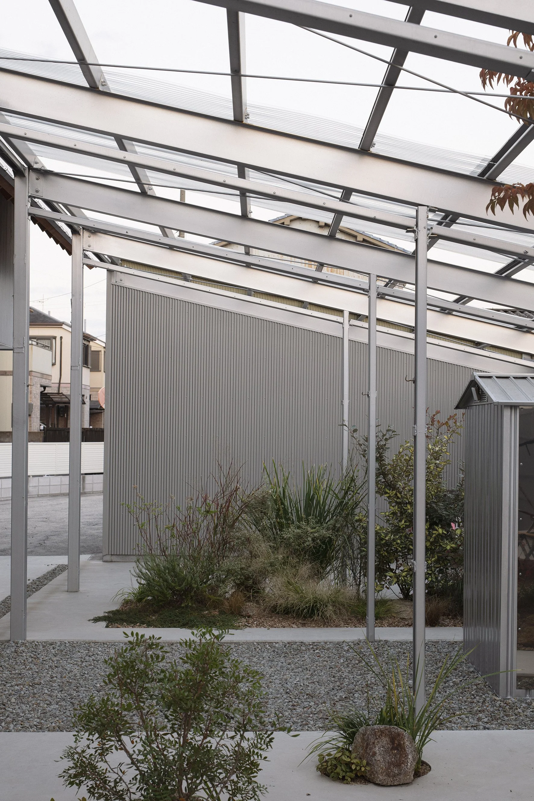 まず既存車庫は壁、天井を解体、柱梁の状態にし、傷んだ部分に補修を施した。躯体の顕になった車庫は、車を停めるための機能/規定された寸法がリセットされ、その大部分に屋根を掛け直すことで、特定の機能を持たない半外部空間とした。そこに添えるように計画した住宅の軒先は、既存車庫との関係を均質に保つために高さを揃えているが、敷地奥は寝室や子ども室を備えた二階建てのより親密な空間としているので、逆に高さを確保するために棟木は迫り上がり、自然と屋根がねじれる形状となった。敷地を俯瞰すると、周辺からそのねじれた屋根だけが見え、屋根がこの建築のファサードを築いているようであるが、近づいていくと徐々に車庫にスケールダウンするという不思議な建ち方をしている。また柱は住宅部分の構造体としての役割だけでなく、半外部から延長された内部を規定するための存在として位置付けている。床の素材は、双方ともに柱間で分かりやすく切り替え、部屋のような気配をつくった。それに家具が加わることで、その特異性を取得する。妻側から見る風景は、柱間に従ってシーンが切り替わり、既存車庫の存在を微かに呼び起こす。